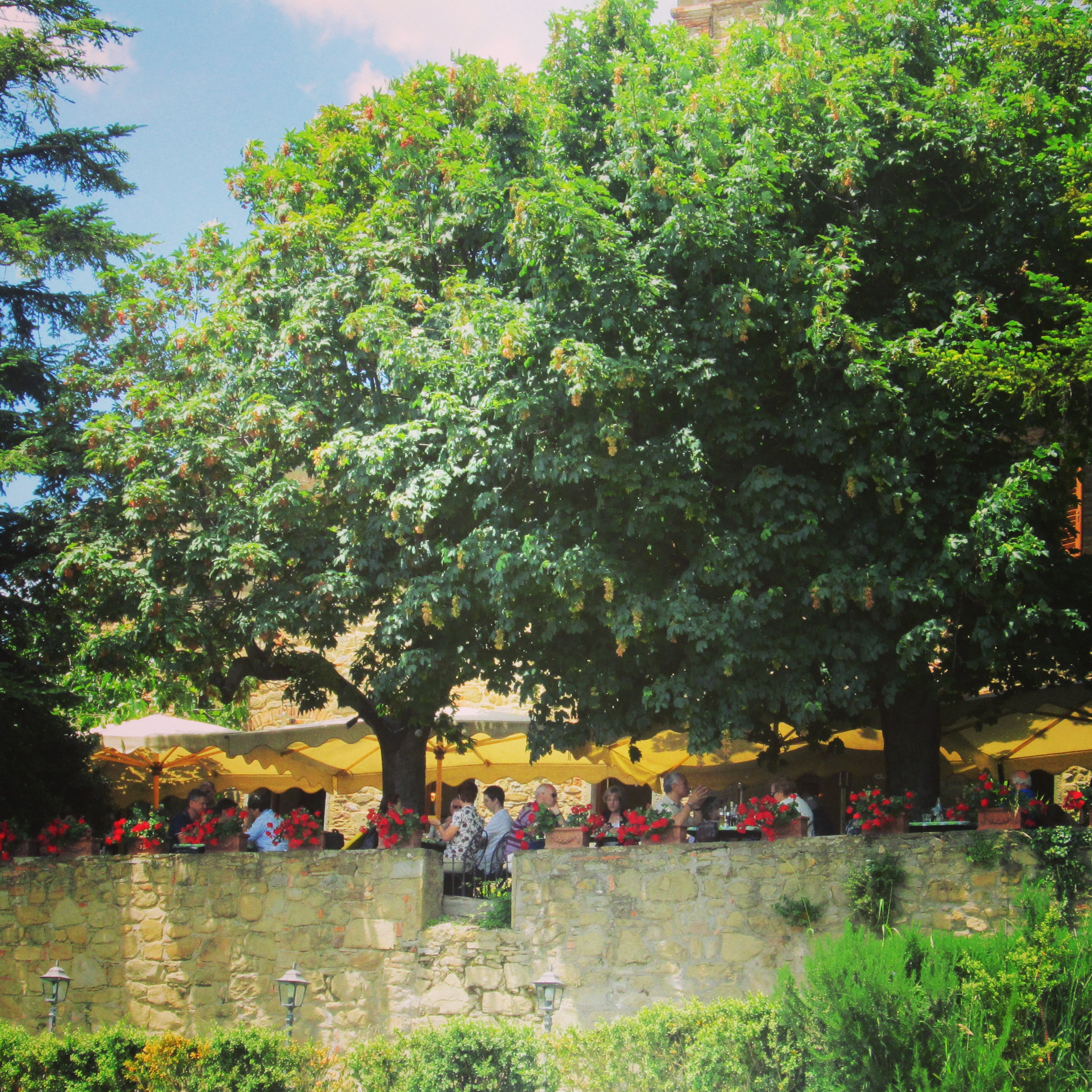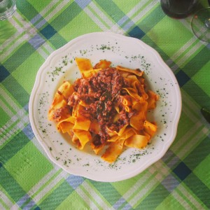 Mais arrêtons de nous mentir, le véritable objectif de ce voyage étant encore une fois la cuisine toscane, votre déplacement tiendra ses promesses grâce à un déjeuner ou diner à la Bottega di Volpaia. Une terrasse avec vue (et quelle vue !), des tablées sans prétention, une famille propriétaire chaleureuse (Gina la mamma aux fourneaux et Carla sa fille qui reprend progressivement le flambeau), c’est la convivialité et le tempérament ‘brut’ toscan par excellence. On a adoré la pasta al tartufo (pates aux truffes), les pappardelle ragù e funghi porcini (pates au ragout de viande et aux cèpes) et le tiramisu. Apparemment il vous faudra aussi tester le cinghiale e olive (sanglier aux olives) que nous n’avons pas eu l’occasion de gouter. L’addition reste très raisonnable (moins de 50 euros à 2 pour 1 plat de crostini partagé, 2 primi de pates, 50 cl de vin rouge, tiramisu et café).